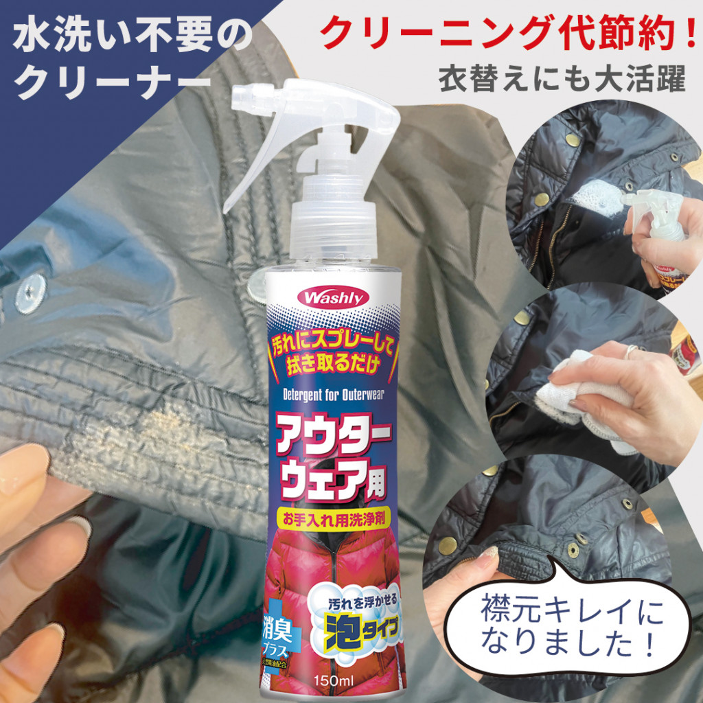 洗えない冬服や小物などのちょっとした汚れを落とすなら、「WASHLY アウターウェア用」のような拭き取りタイプの洗剤を使う方法もあります。